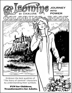 Her Jasmine: Journey Into Power coloring book got ambitious. Its theme is centered around the characters of a fantasy-adventure story she’s writing [Patreon.com/Darlene_artist]. Darlene includes the meaning of color and defines the symbolic meaning behind background images. The idea is that coloring the symbols while being mindful pinpoints specific issues to work on in your life.